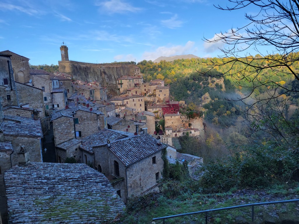 The next morning, as we planned for a full day, we start with yet another espresso and drive towards the Val d’Orcia region. An impeccable drive with twist and turns along side the mountain tops. With Fall/Winter temperatures, the leaves were coloured in a rustic shade adding to the beauty of the area. We visit Sorano’s old part of town that is carved along the mountain side. With the high elevation and the abrupt steep descents, one wonders on how the locals can go about their daily routines.