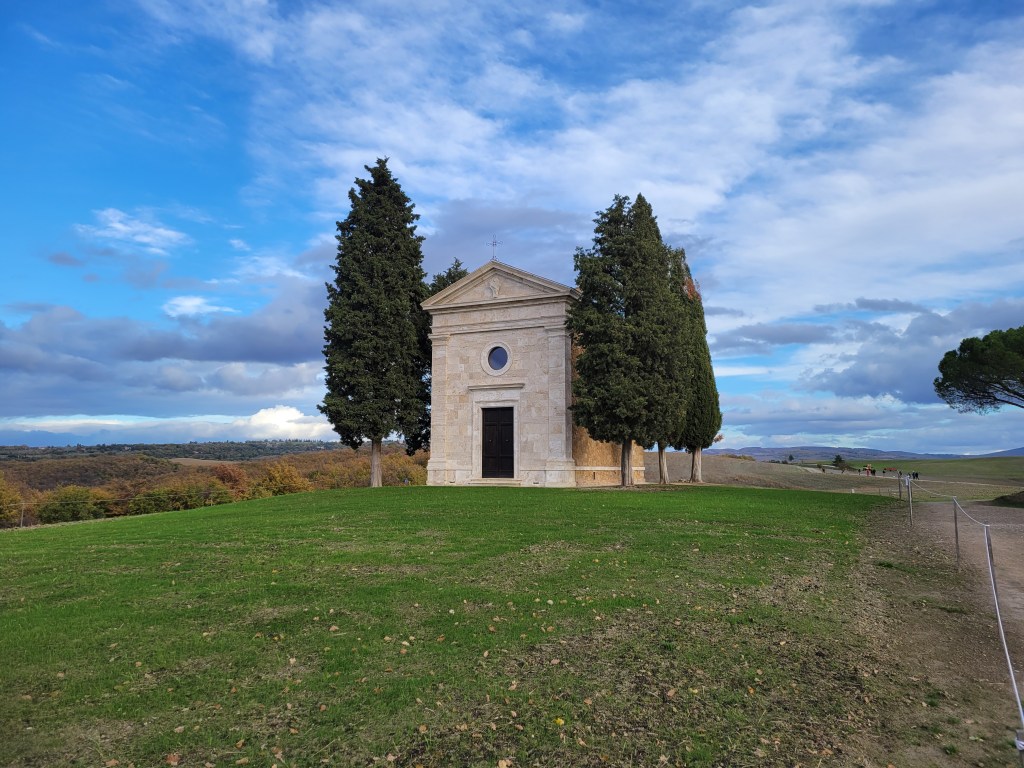 We decide to continue our journey by driving south of Tuscany to the Madonna di Vitaleta Chapel. A small chapel perched on the top of a hill in Val d’Orcia. It is one of the most iconic spots in the area and often chosen by photographers as the quintessential Tuscan landscape.