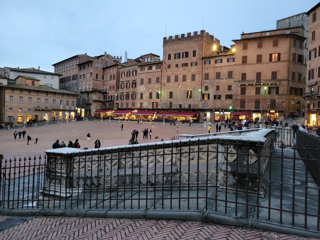 With not much daylight left, as the sunset happens quite early in November, we head for supper in Siena. We find ourselves at Piazza del Campo, Europe’s greatest medieval squares and while having a local pizza, Nick recounts the history of the square to which the renowned horse races happen. Palio di Siena!