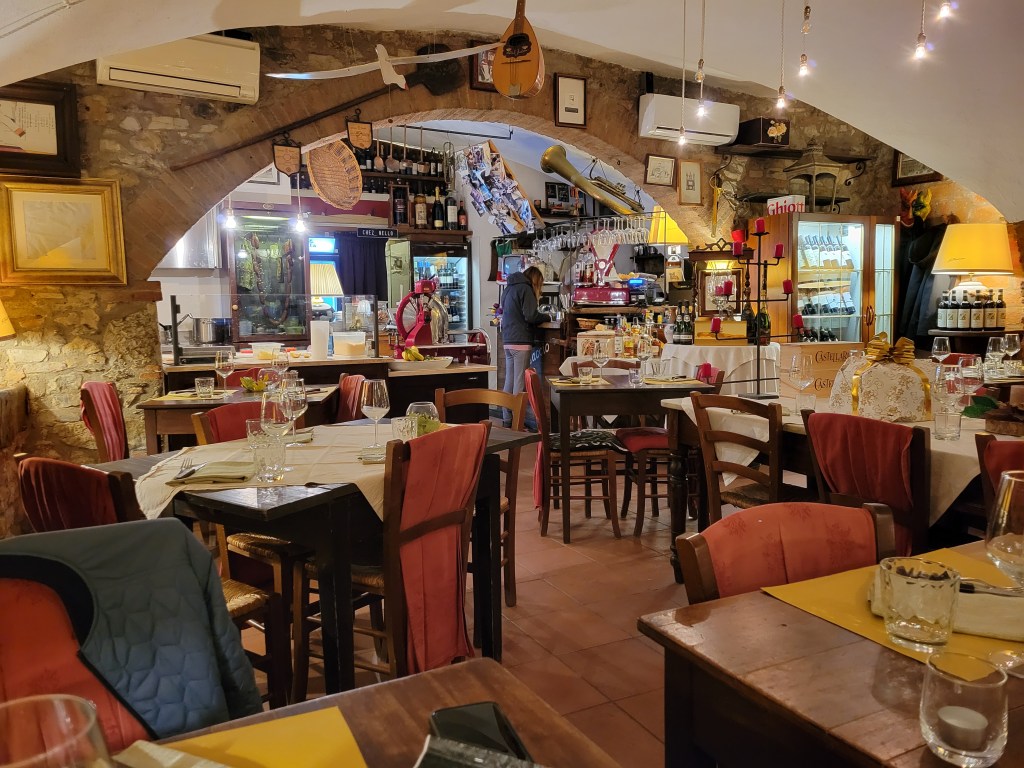 We continued our journey to San Gimignano, a gorgeous hill top town in Tuscany encircled with 13th century walls and towers. With the light rain, fog and silhouettes from the street lamps, the gothic medieval appearance gave us a true sense of that era. We enter a quaint restaurant with only 3 tables, and as 2 were already taken, we maxed their capacity and enjoyed a great dinner. Their “on the house” Toscana Bruschetta was exceptional. A quick ride along Cypress Alley and we end the night at Nick’s favorite night cap café.