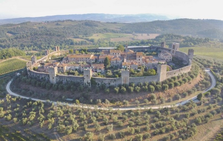 The cozy and charming small town of Monteriggioni is perched on Monte Ala and towers majestically over the Tuscan landscape. The impressive medieval city walls and well preserved defense towers dated from 1213, were built for the Republic of Siena as a base against Florence.