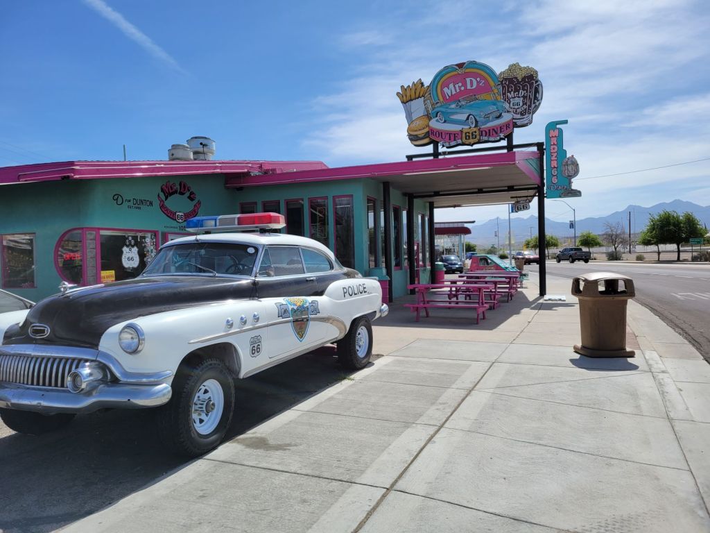 Next day, as we had to cover Seligman, Kingman, Oatman and Barstow, we headed out very early. During our walk along the small town of Seligman, a local explained as to why it seemed completely deserted. It turns out that the Route 66 parade usually starts early May which kicks off the route 66 festivities. We take a short break for lunch at Mr.D’z Diner which again, brought us back to the 1960’s with all their old fashion decor. I thought we were on the set of Happy Days!