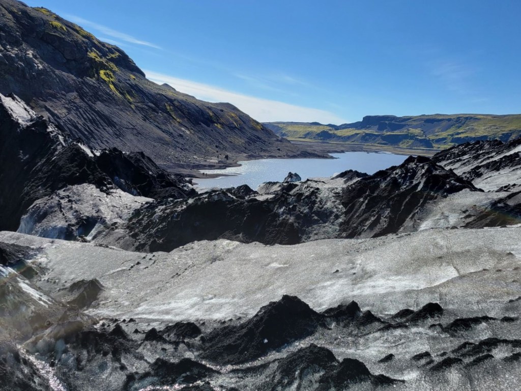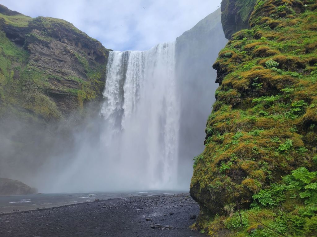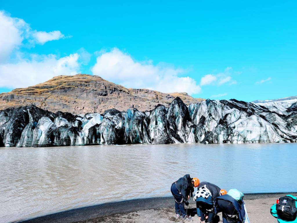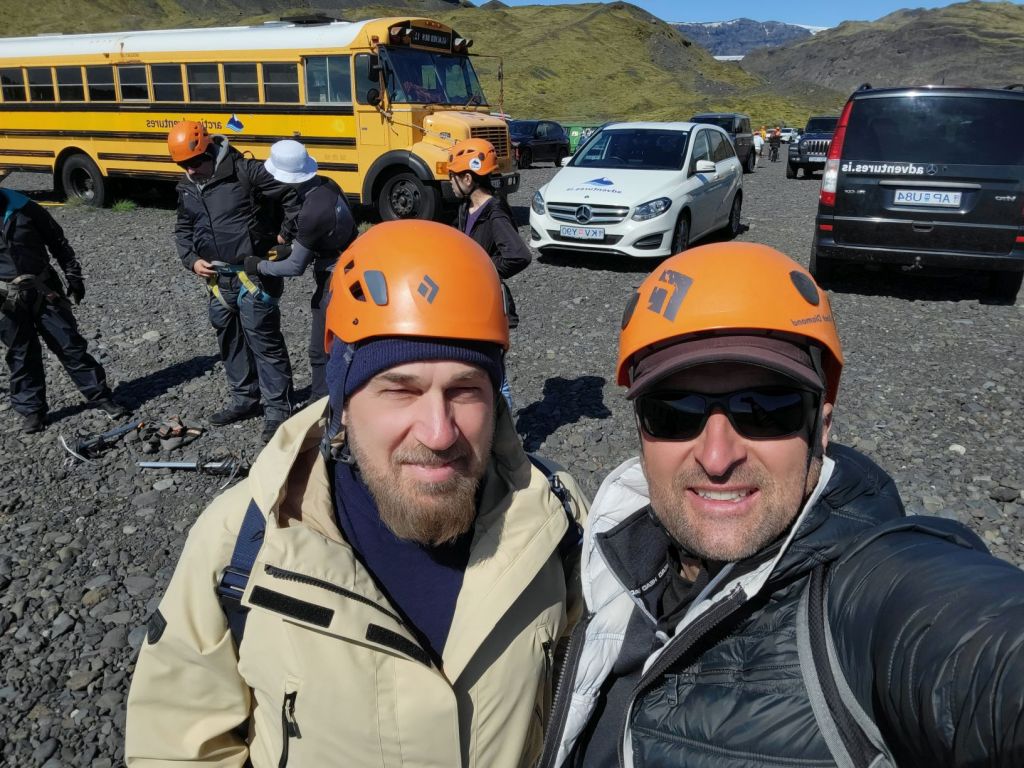 Unlike Friday’s weather with drizzle and rain, Saturday was calling for beautiful skies. Just splendid with our Solheimajokull Glacier Hike tour. With the Skogafoss waterfall along the way, it was a must we climb over 350 steps for a view out over south Iceland’s coastline.